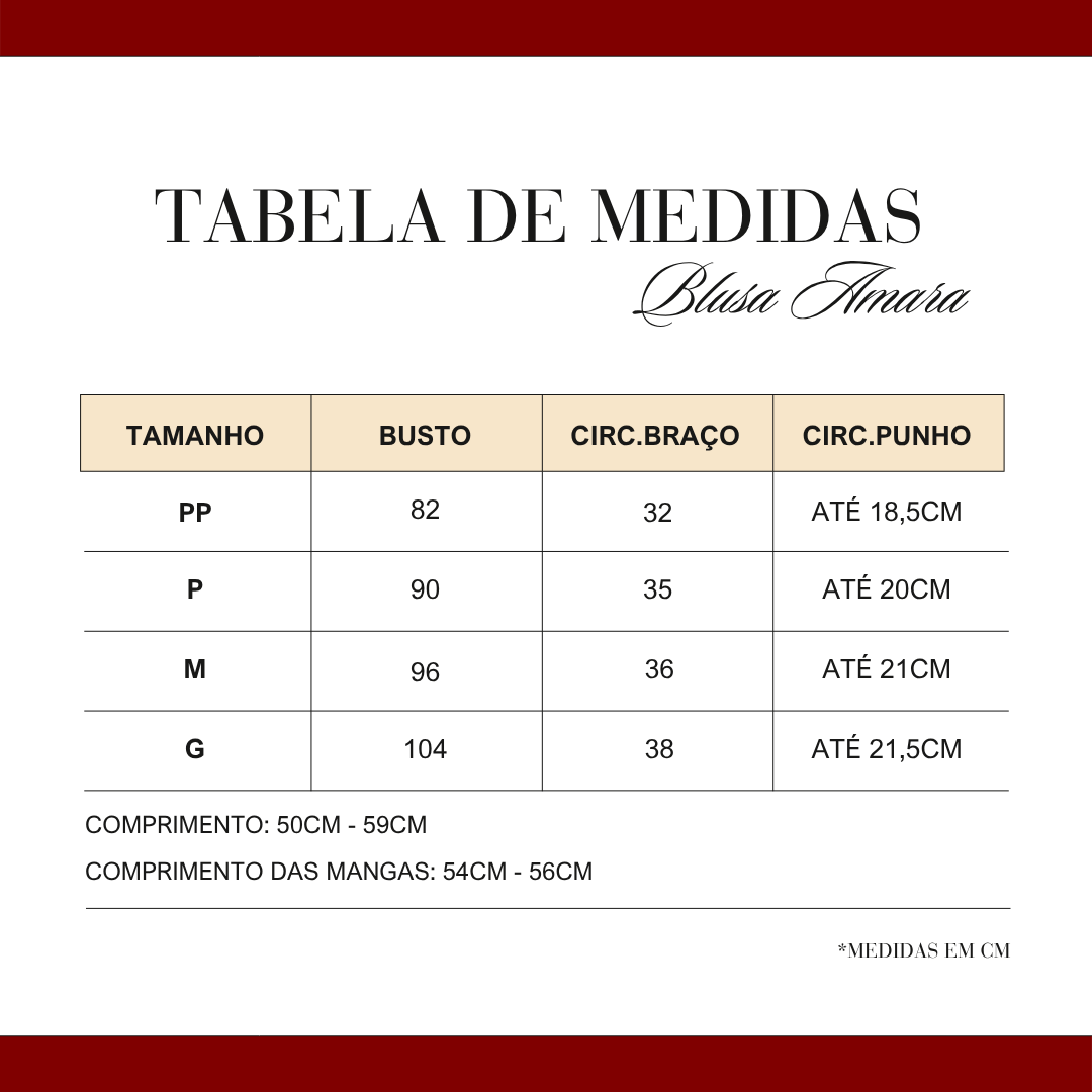 Altura: 1,66m | Busto: 82cm | Cintura: 65cm | Quadril: 92cm